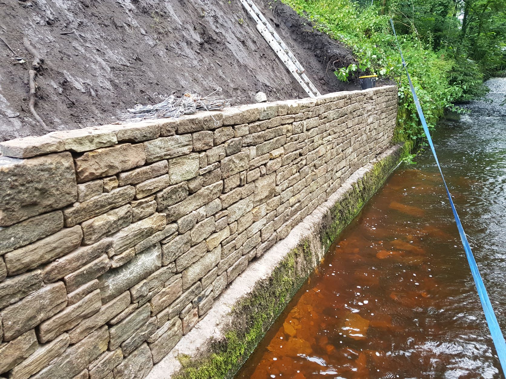 The team at RAB were commissioned to design a solution and oversee the repairs. This involved the complete removal of vegetation (including rootballs), and construction of a blockwork wall with dry stone wall facias, utilizing the existing stone where possible. The bank was reprofiled, and the final stage involves reseeding and demobilisation of the compound.