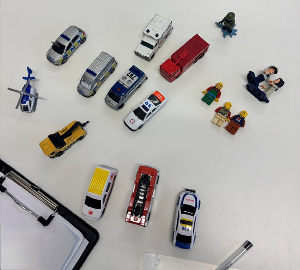 The scenario detailed a fast-moving wildfire following a UK record-breaking heatwave, spreading rapidly towards a critical national infrastructure site. Participants deployed their limited resources on a site map using figures and tokens to represent what they had available. By physically positioning the figures, the two groups could visualise resource distribution, identify gaps, and discuss strategies in a tangible, engaging way.